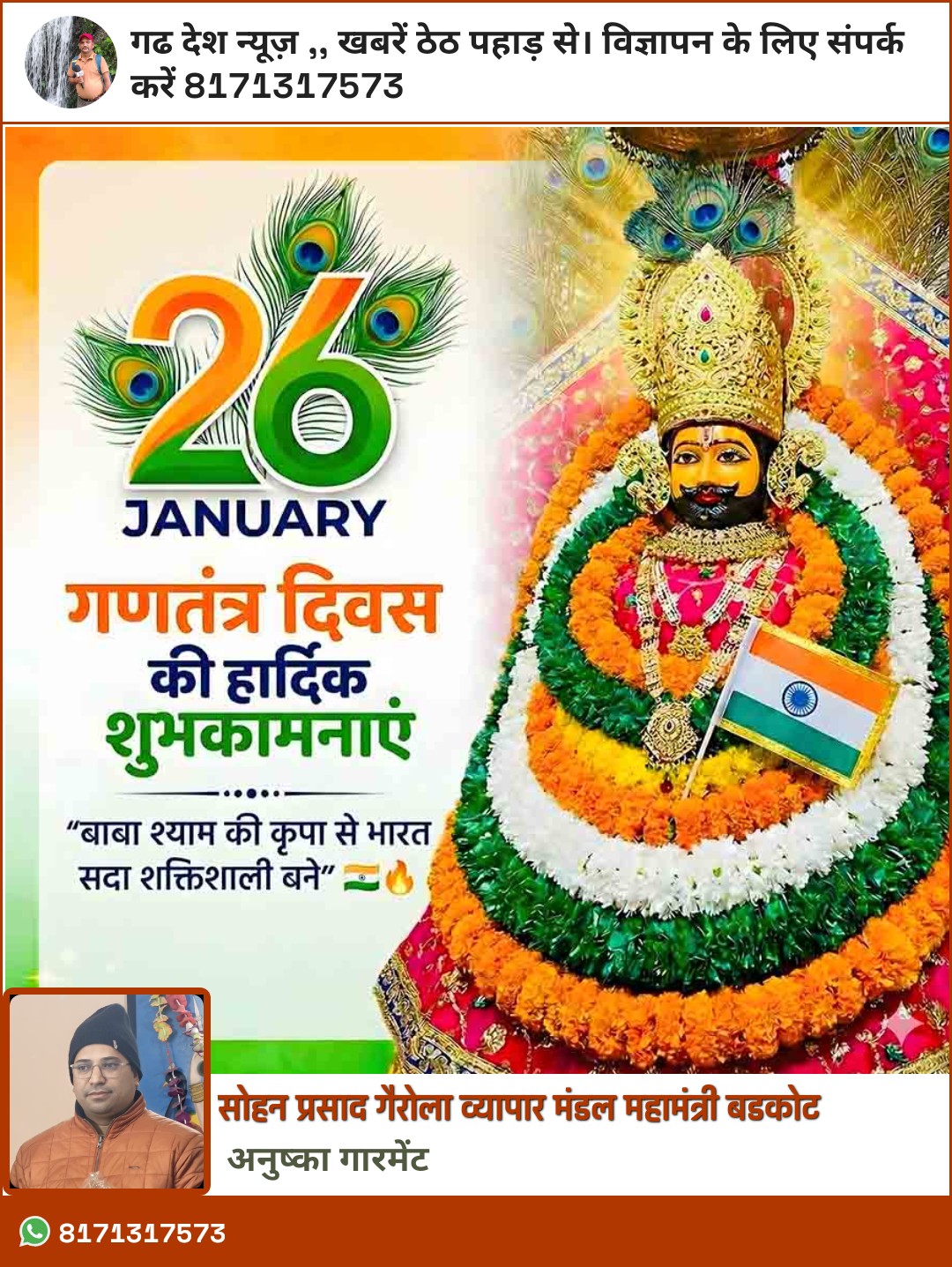 गणतंत्र दिवस पर व्यापार मंडल महामंत्री सोहन प्रसाद गैरोला ने दी देशवासियों को शुभकामनाएं, बाबा श्याम से राष्ट्र की शक्ति व समृद्धि की कामना ।