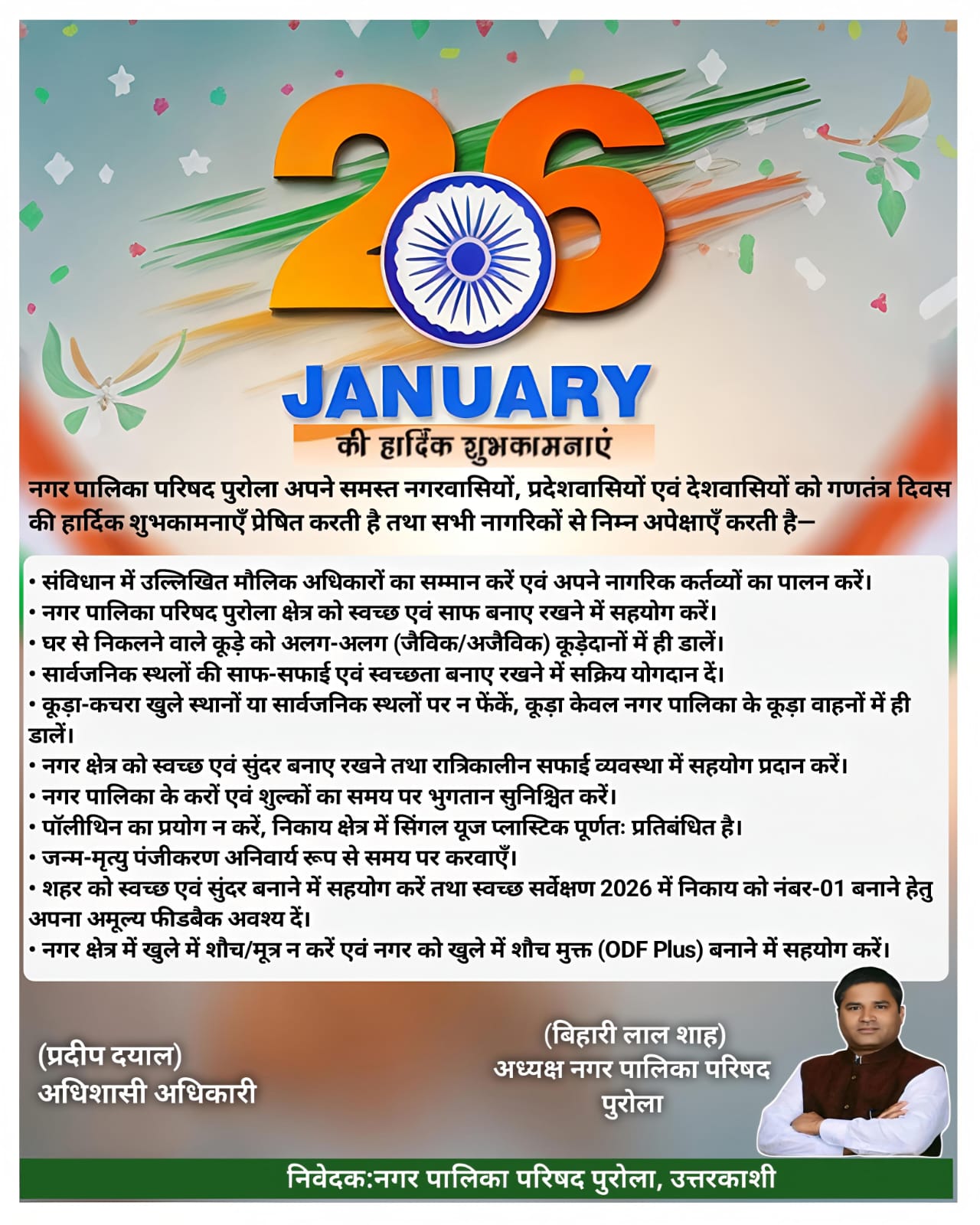 गणतंत्र दिवस पर पूर्व जिला पंचायत अध्यक्ष दीपक बिजल्वाण ने दी शुभकामनाएं, संविधान व राष्ट्रभक्ति का दिया संदेश ।